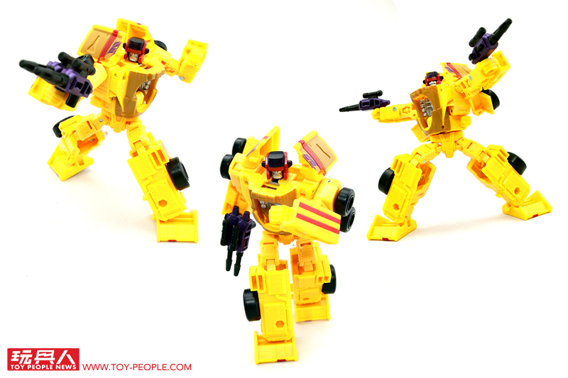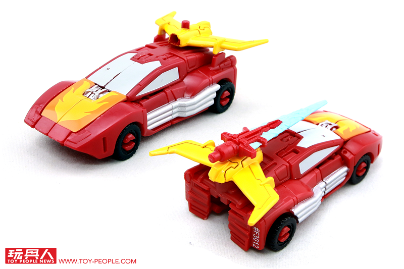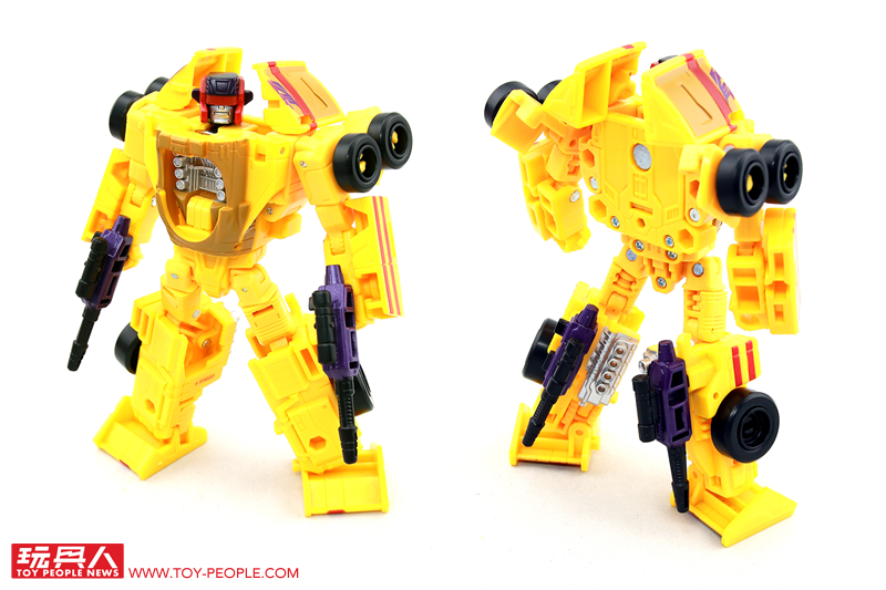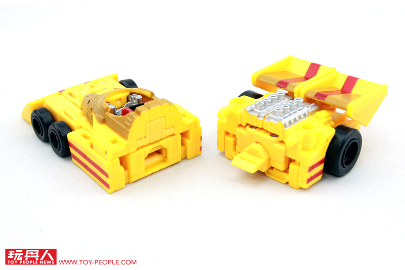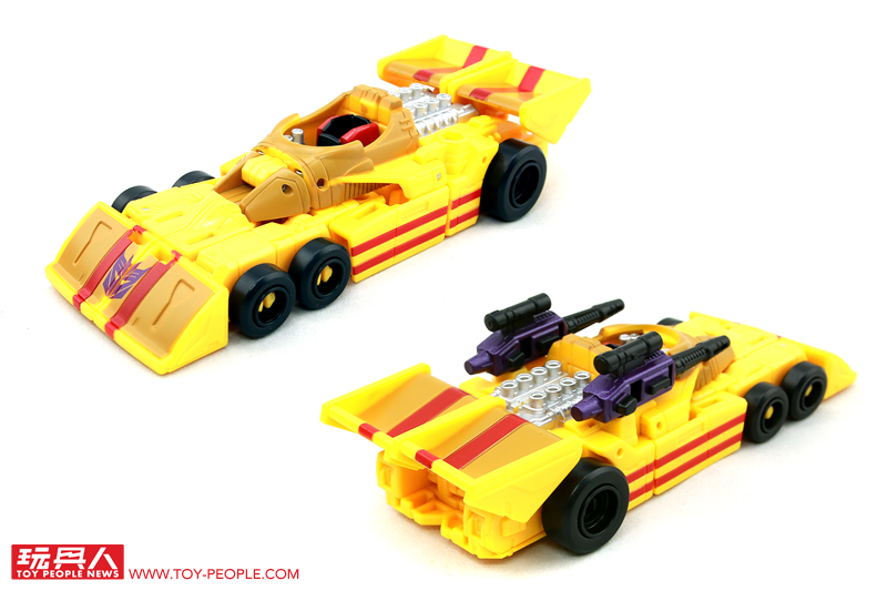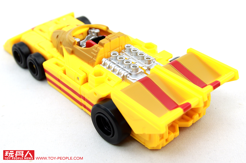 ▼載具模式,相當致敬G1的F1賽車造型,黃底與紅色的條紋拉花都予以重現,雙槍此時可收納於引擎的兩側。