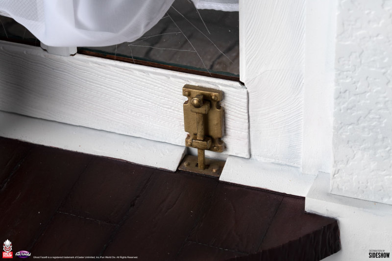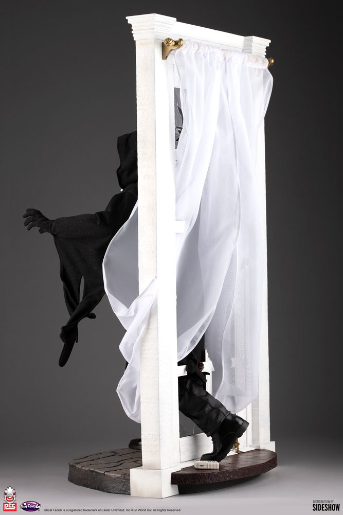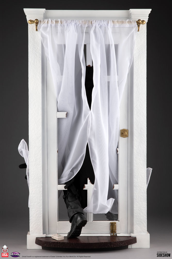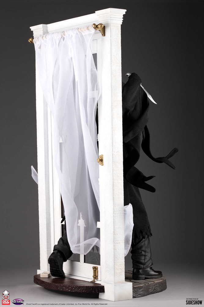 本作高約 74.9 公分,展現出「鬼臉殺手」手持小刀追逐獵物、破窗而出的躍動姿態,本體部分的面具、長褲、靴子皆是以 Polystone 為材質雕刻而成,不過長袍、兜帽、手套......等則採用布料製作,並可利用藏於帽子、袖子裡頭的鐵線彎折出不同造型,表現出劇中鬼臉殺手跑動時的速度感、服裝飄逸感,以損壞落地窗為題設計的場景底座也仔細的製作出碎玻璃,窗簾部分同樣設有鐵線,仔細一看,還可以發現掉落在地板上的變聲器零件!