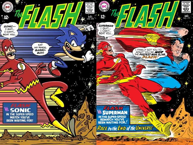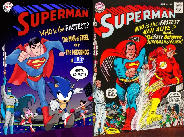 除了閃電俠,要提到速度,當然也要說那位最偉大的超級英雄「超人」。這是致敬於1967年的《Superman》#199,是由Rod Allen所繪製,不過是將原本在右邊的閃電俠,改成了藍色刺蝟索尼克。