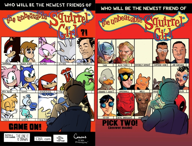 當然,除了DC外,Marvel Comics的部分同樣也成為繪師們的致敬對象,例如CBR所提供的這一幅圖,正是由繪師Caanan Grall以2015年發行的《The Unbeatable Squirrel Girl》#6為原型,並將方格內的角色全數換成《音速小子》原著中出現的多名角色。