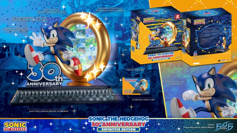 本作高約 41.5 公分,是根據 SEGA 官方所發佈的《音速小子》30 週年視覺圖為題設計,打造出彷彿從巨大金幣圈飛奔而出的音速小子,再現了他的尖耳朵、纖瘦的四肢、白手套、紅白跑鞋......等造型特徵,臉上自信滿滿的神情也出色還原,一旁還有一座藍白配色的 30th Anniversary 立體展示牌,底座也注入巧思,在四面分別刻畫出代表 Studiopolis Zone、 Chemical Plant Zone、Press Garden Zone,以及最經典 Green Hill Zone 碧山區域的圖紋元素。