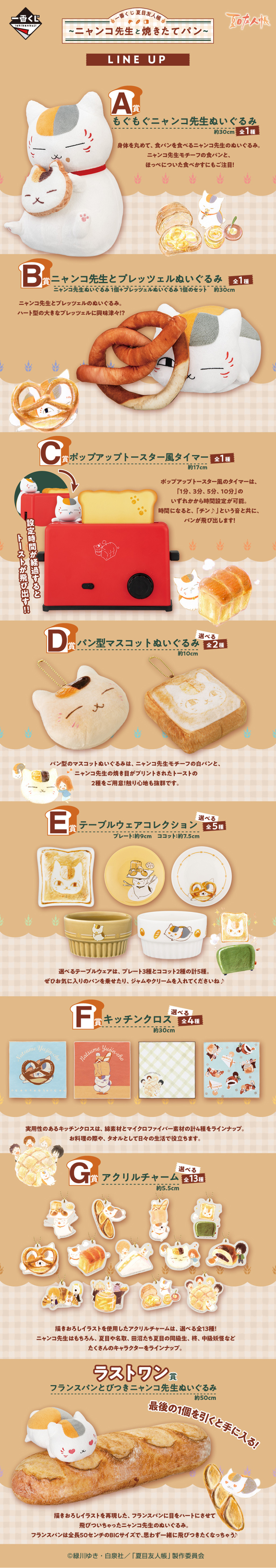「一番賞 夏目友人帳 貓咪老師與熱騰騰出爐的麵包」,一共推出全 7 等級+最後賞的獎品,以慵懶可愛的超萌貓咪老師為主角,再加上香噴噴剛出爐的鬆軟麵包~溫暖又療癒!獎項分別為 A賞 嚼嚼貓咪老師絨毛布偶、B賞 貓咪老師和蝴蝶餅絨毛玩偶、C賞 彈出式烤麵包機造型計時器、D賞 麵包絨毛玩偶吊飾、E賞 餐具系列、F賞 廚房布巾、G賞 壓克力吊飾等豐富的獎品,最後賞更是 50 公分大的超療癒法國麵包與貓咪老師大型絨毛玩偶!