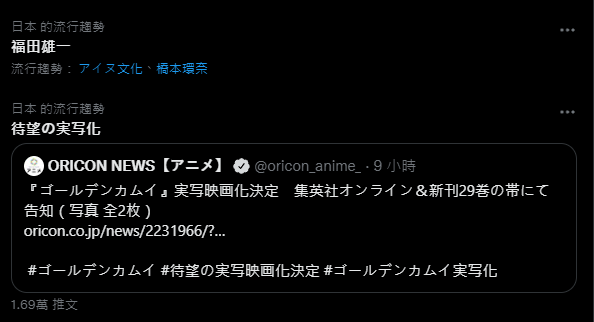 不過由於尚未詳細公告參與《黃金神威》真人版電影的製作團隊與演員卡司,因此在官方消息發布後,不只是迅速竄上今日Twitter的熱門趨勢,更讓不少讀者粉絲敲碗希望是由成功改編《銀魂》(銀魂)、《我是大哥大!!》(今日から俺は!!)…等漫改影視的「鬼才導演」福田雄一來掌舵。