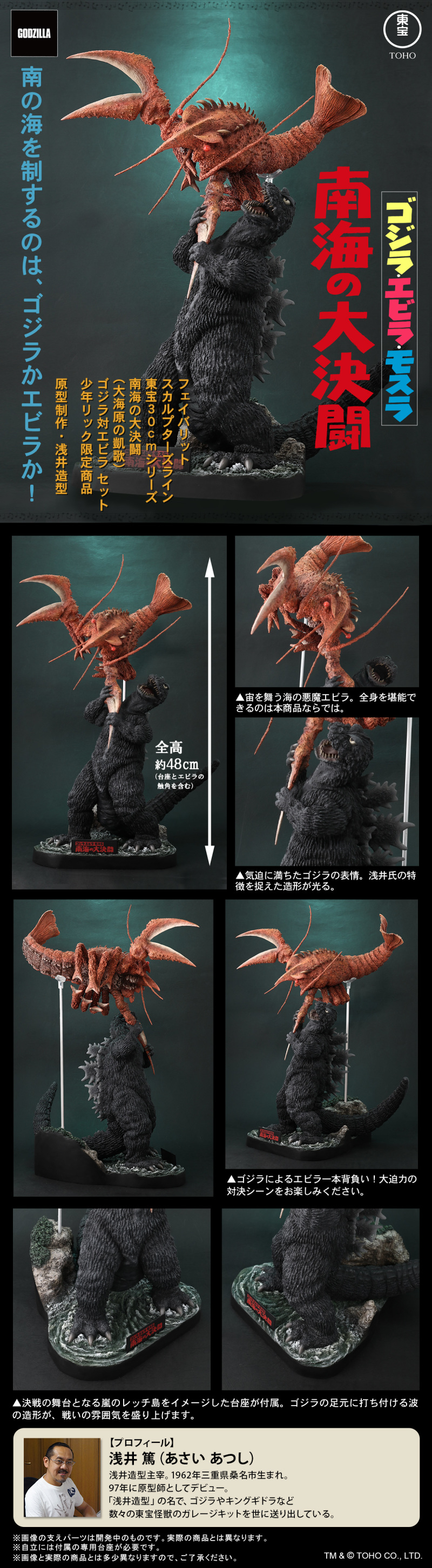 「FAVORITE SCULPTORS LINE 大海原之凱歌 哥吉拉對伊比拉」,由淺井造型(淺景篤)擔任原型製作,尺寸全高 48 公分,將哥吉拉在水中與龍蝦怪獸伊比拉的激烈對戰場景立體化,哥吉拉將沉潛於海中的大龍蝦從水中拉出,營造十足動態感的同時,也讓伊比拉的軀體完整現身!一雙大螯和充滿生物感的甲殼、尾部及觸鬚都精製再現!