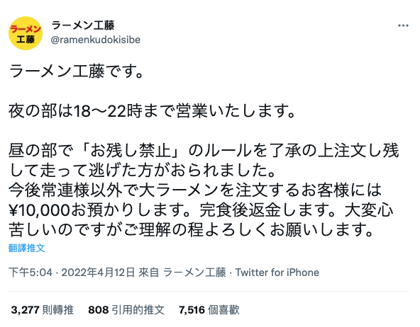 不過,既然是大份量,自然就不是人人都吃得完,許多店家都會提醒客人,如果以前沒有經驗,最好是先從小份點起,以免發生吃不完的窘況。大阪的店家「拉麵工藤(ラーメン工藤)」,最近則是貼出一篇引起相當多討論的貼文,原因就是他們表示「今後除了常客之外,點大份的客人需要先繳納1萬日圓的挑戰金,完食後便會退還」。
