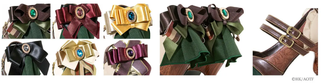 設計上後跟的緞帶採用角色頭髮的顏色,搭配眼睛顏色的寶石來設計。包含鞋底、後跟與綁帶都具有著調查兵團的特色在。