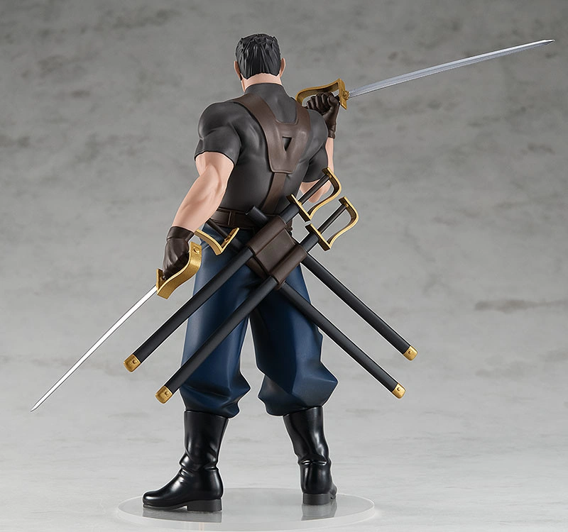 「POP UP PARADE 金格‧布拉德雷」高約 18 公分,是根據他率領軍隊、進攻人造人「古利德」基地時的造型來設計,上身是相當貼合的黑色緊身衣、褐色背帶,下半身則是藍色軍褲、黑長靴,展現出雙手持劍的備戰姿態,清晰可見的肌肉線條更是將他的硬派氣息再加強,除了瞪視前方、極具魄力的威嚇眼神之外,本作最搶眼的就是布拉德雷身後的劍鞘啦~利用特製劍鞘套讓這位鋼鍊近戰最強之男一次可以攜帶五把長劍!帥翻。