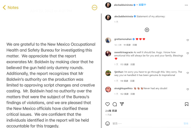亞歷鮑德溫貼出了他的律師所寫的聲明:「我們感謝新墨西哥州職業健康與安全局調查此事。我們感謝該報告澄清了鮑德溫先生當時是認為槍內僅裝有假彈,從而免除了鮑德溫先生的責任,此外,該報告也承認鮑德溫先生(身為製片人)對於電影的管理權僅限於批准劇本的更改和選角上的決策。鮑德溫先生對於調查局發現的違規事項並無任何管理權,我們很高興新墨西哥州的官員澄清了這些關鍵問題。我們相信,報告中所判定的某個人將會為這場悲劇負責。」
