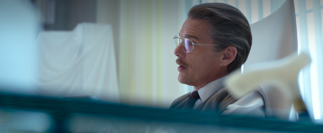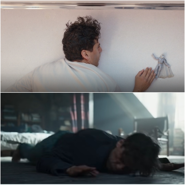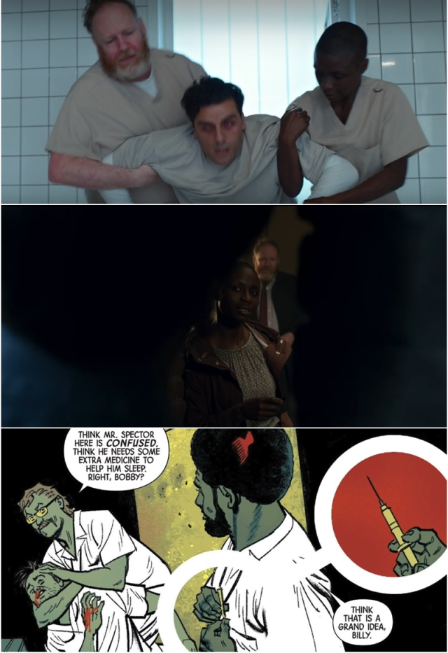 6. 精神病院 下一幕,我們發現馬克在一個近乎全白的精神病院甦醒,而我們這四集經歷的一切「似乎」都只是他的幻想。這條故事線取自《月光騎士》第8期,馬克史貝特被囚禁在一個精神病院裡,整條故事線虛實交錯,營造這一切都是他所幻想的假象。