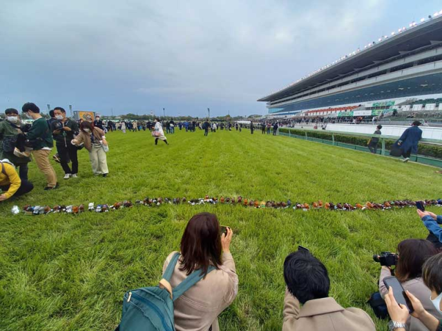 上圖為舉行皋月賞後開放觀眾進入的中山賽馬場草地,可以看到有好幾十隻玩偶小馬在草地上佇立著,拍攝者為のなー(@mizu25001600),推文內容寫著「中山賽馬場的馬場解放後舉辦的玩偶錦標,約有76隻小馬站在草地上。」
