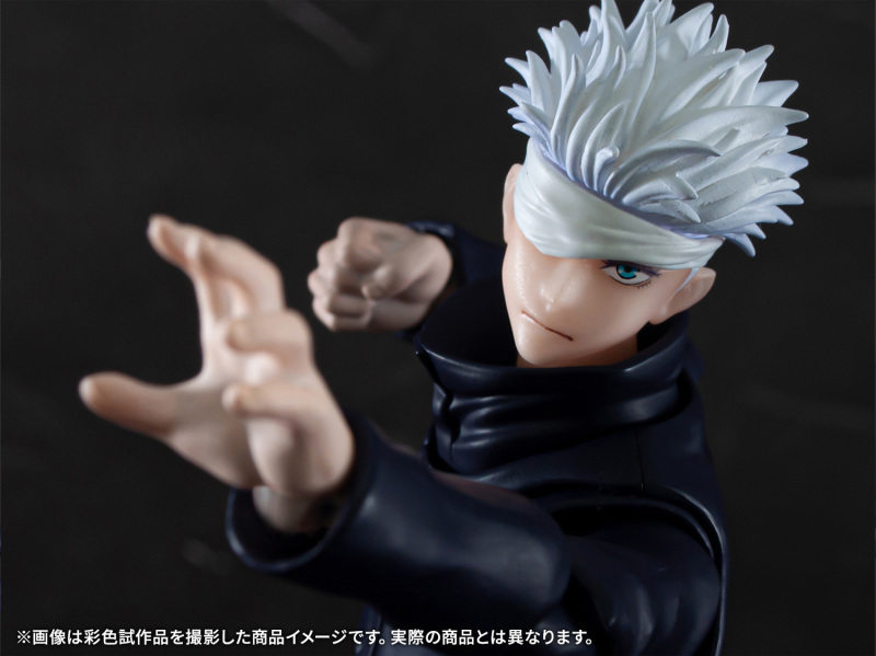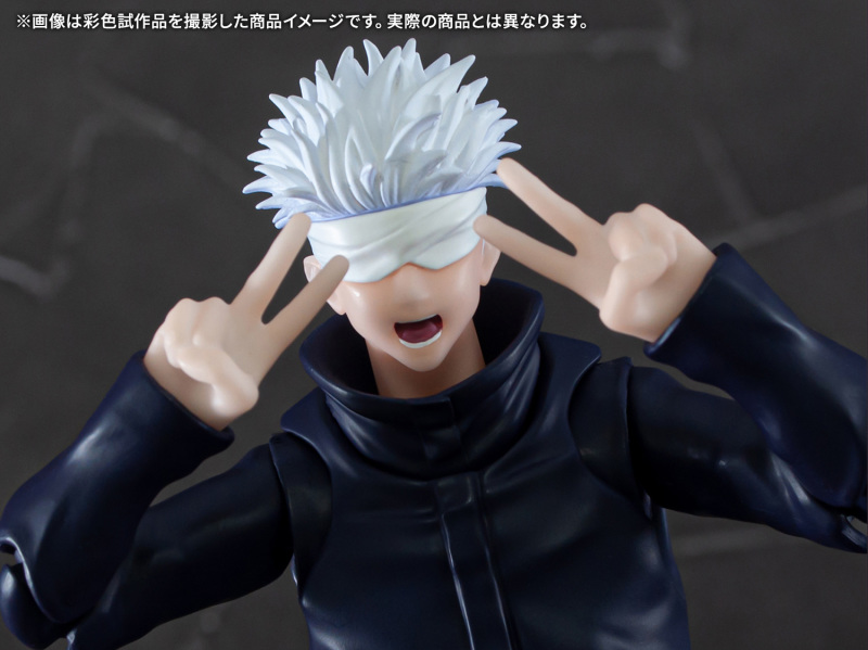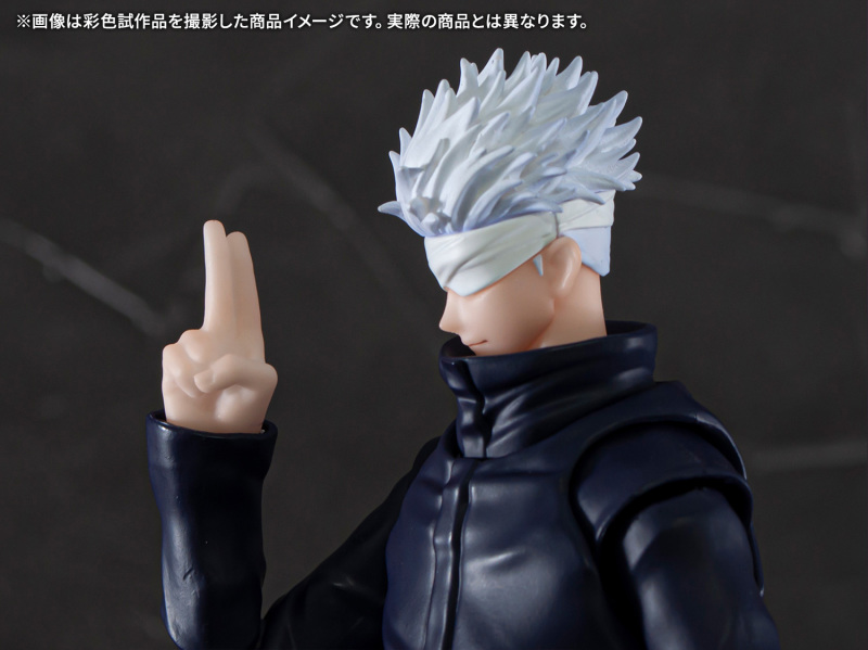 「S.H.Figuarts 五條悟」,尺寸高約 170 mm,再現五條老師高䠷修長的身材與一頭銀白髮,白色繃帶遮住眼睛的特色造型。配件有普通臉、露齒笑臉、戰鬥吶喊臉以及露出單邊美瞳的替換零件,另外更有追加有比YA、「帳」和帶有招式特效件的多款新規手勢,能賞玩出劇中各種精彩的動作與場景!