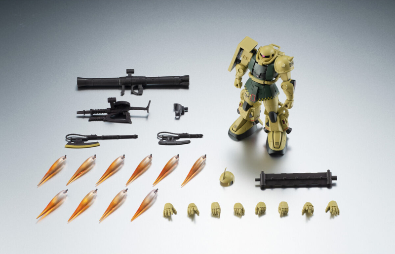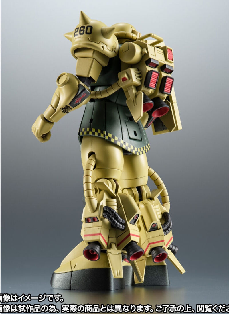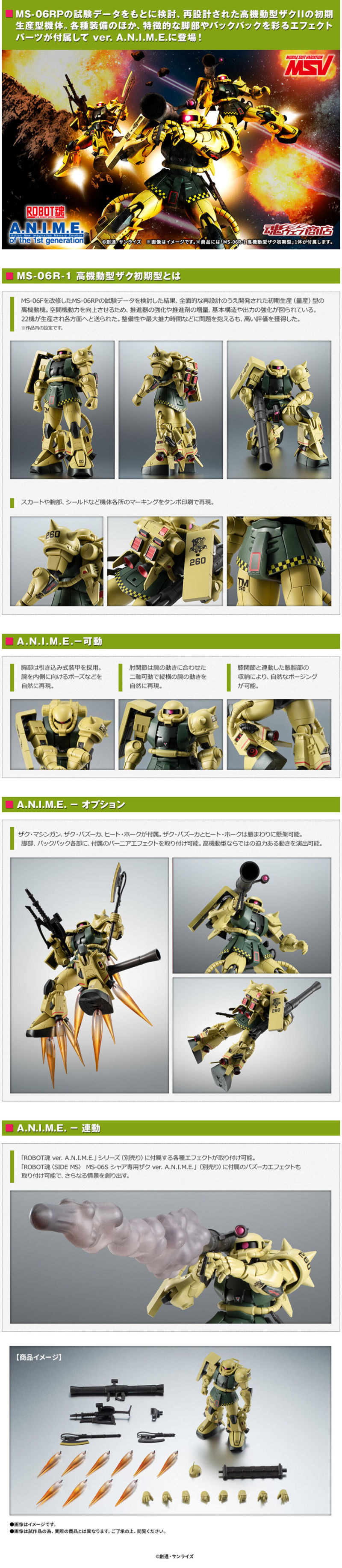 「ROBOT魂 高機動型薩克初期型 ver. A.N.I.M.E.」以全高 12.5 公分尺寸再現背包、腿部推進器等精密細節,並再現初期型獨特的機身色彩與編號標誌。肩部、手肘、膝蓋等全身多處關節採用拉出式、雙重關節設計,獲得靈活而自然的可動範圍。