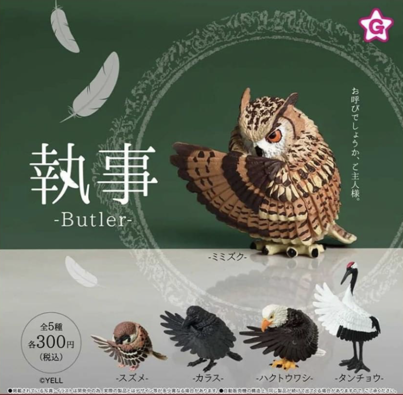 這次將各種鳥類擬人化之後重新詮釋的「鳥執事」,讓牠們展現出把左翼往右肩彎曲、頭部微低的管家經典姿態,瞬間變得極具靈性且優雅!一共包含了丹頂鶴(タンチョウ)、烏鴉(カラス)、鵰鴞(ミミズク)、白頭海鵰(ハクトウワシ)與麻雀(スズメ)5 款,每一隻鳥執事全身上下的羽毛細節、鳥喙、鳥仔腳都有不錯的刻畫,除了丹頂鶴之外,其餘鳥執事都能藉由尾羽達到穩穩的三點平衡,白頭海鵰可說是氣勢十足,麻雀則是有種孩童裝大人的趣味~高挑、漂亮的丹頂鶴也是必收的一款啊!