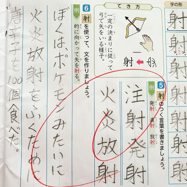 日本一位網友KOU.(@kou.yukino)分享了她兒子小學時期的漢字練習答案,其答案內容真是看不出是位小學生寫出來的,從小就有那麼強大的造詣能力和想像力,例如下圖的「射」字,小孩造出了「我為了想像寶可夢一樣使出火焰放射所以吃了100個辣椒。」(ぼくは、ポケモンみたいに火炎放射をふくために唐辛子を100個食べた)小小年紀能吃一百個辣椒,是個狠人。