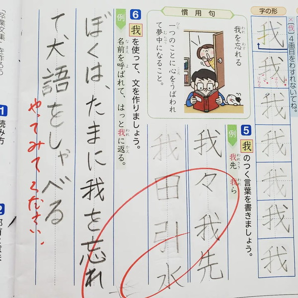 其他還有以「我」造句,小孩的答案是「有時我會忘我得叫出狗語來」(ぼくは、たまに我を忘れて犬語をしゃべる)這是忘記自己是個人類了嗎?以「机」(桌)造句,小孩的答案是「因為我的學校桌子有5公尺高,所以我一直都是在地板上學習。」這是哪門子的課桌椅。而老師看到這些答案也不忘寫點評語,如「試著用狗語說話吧」、「一起在地上學習」等有趣的評語。