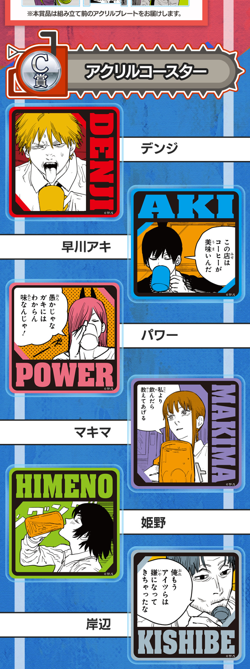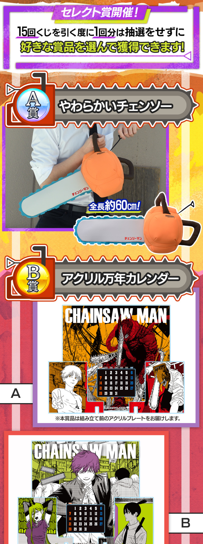 本次「LUCKY賞 鏈鋸人」一共有 5 種獎項,收錄有 60 公分大的 A 賞鏈鋸布偶、B賞 壓克力萬年曆、C賞 壓克力杯墊,以及D賞 恐怖的手巾、E賞 名場景貼紙組等豐富的賞品,此外,每抽 15 張彩票,就能獲得一個精選賞,可以從中選擇並贏得一次最喜歡的獎品!