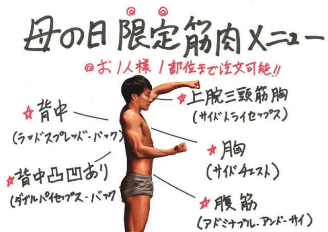始終被大家認為用途不明,由推特帳號「AKIHITO@筋肉紳士集団ALLOUTさん」所創立的免費肌肉素材網站「マッスルプラス」,在網站上時常上傳趣味的肌肉男圖片給需要網友飽眼福而爆紅。沒想到近日宣布與大阪燒肉店鋪「大阪燒肉雙子Futago」 合作,推出「母親節肌肉菜單」,趣味的合作企劃也引起網路熱議。