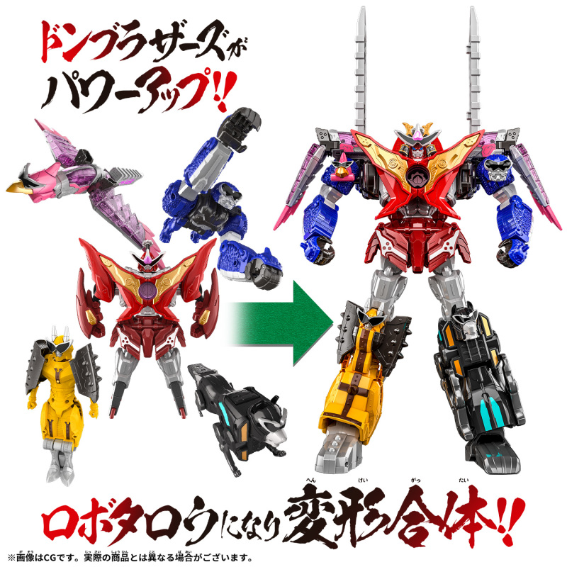 DX DON鬼退神」商品內包含由 Don 桃太郎、猿Brother、鬼Sister、犬Brother、雉Brother 五人所變身的機人太郎,藉由各機機構進行變形合體,具備頭盔與腹肌的著裝、臉部變形與胸口家紋展開機構,合體為體態相當帥氣的 DON 鬼退神,並且是手肘・膝蓋・腳掌・脖子...等多處皆設有可動關節的全可動規格,相較近年的 DX 戰隊機器人更能把玩出躍動的戰鬥姿態!