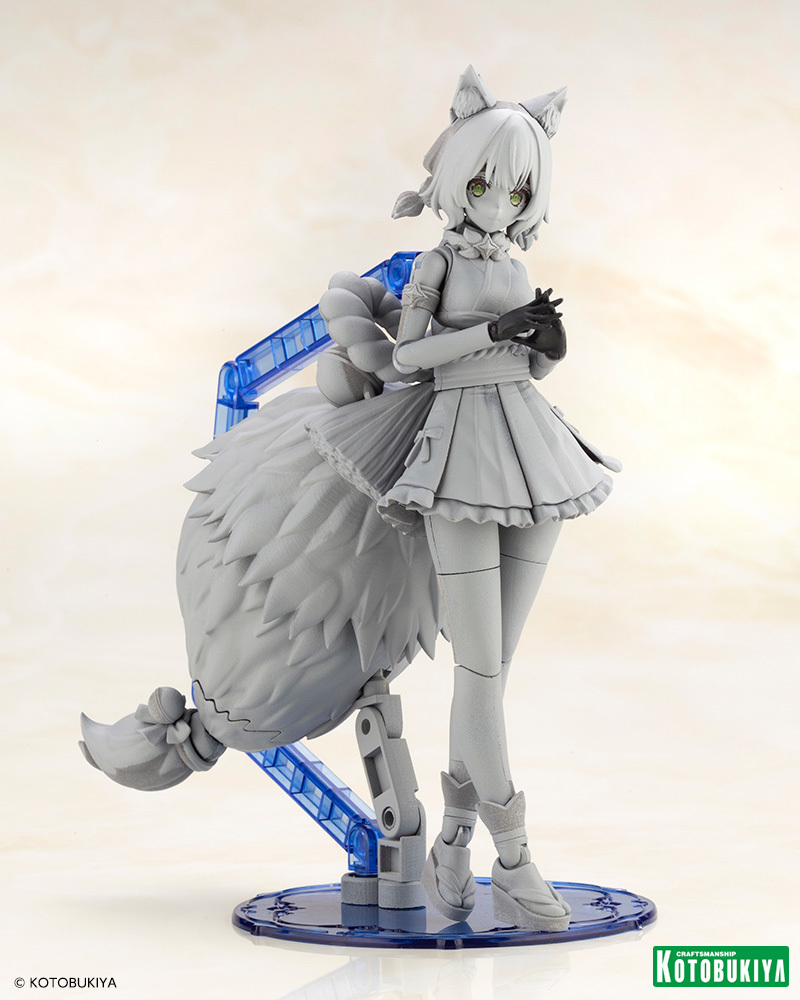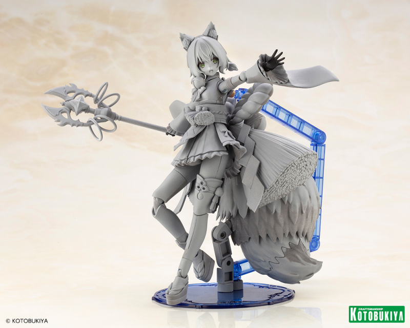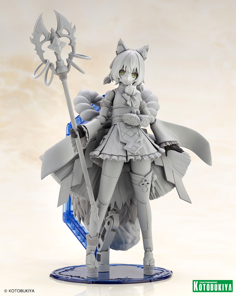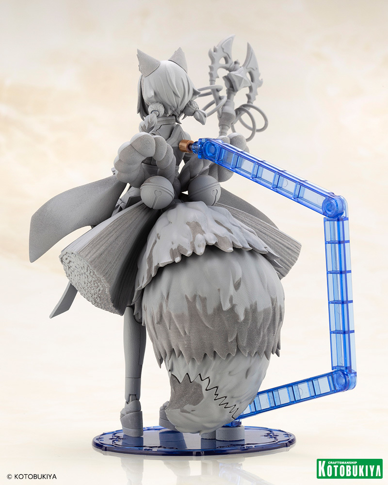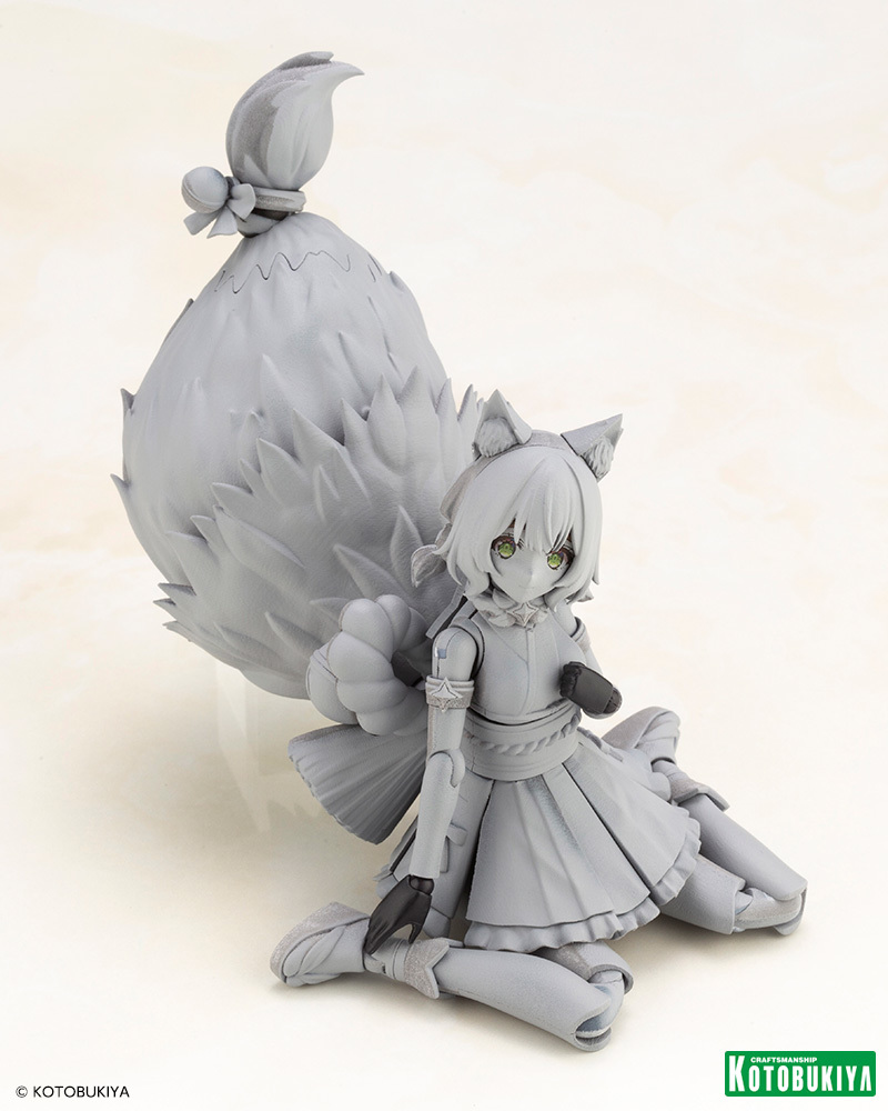 而第三彈角色則是獸人族的「YUKUMO」,造型上結合了日本神話題材中經常使用的「狐仙」「巫女」形象,毛茸茸的巨大尾巴十分可愛。而在公開的未上色原型中也能看見,壽屋透過組裝模型規格徹底製作出巨大尾巴、後腰部的大鈴鐺與注連繩...等造型,讓人相當期待實際商品會如何呈現。
