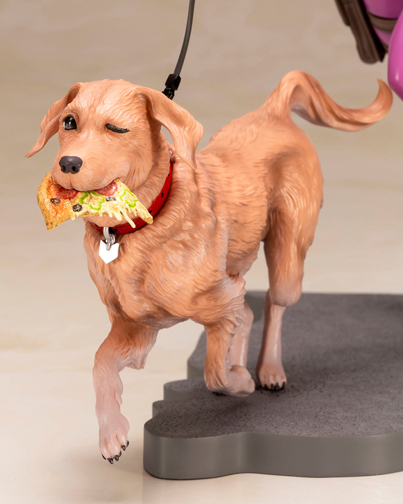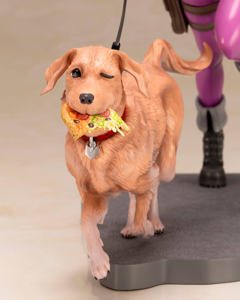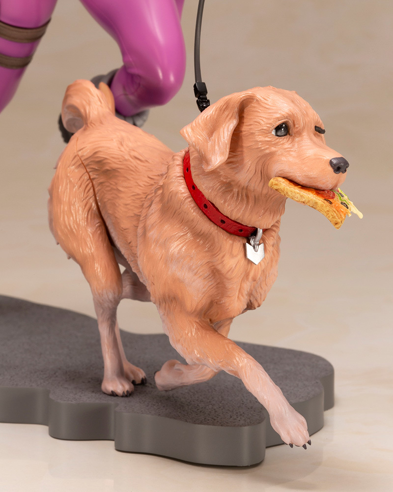 「BISHOUJO 鷹眼(凱特·畢夏普)」高約 25 公分,服裝部分是根據 Matt Fraction 與 David Aja 所創作的漫畫《Hawkeye: My Life as a Weapon》、極具 1960 年代風格的英雄戰衣設計,經由山下俊也重新詮釋之後,整體更具少女的清新美感與初當英雄的新手氛圍,被披薩狗 Lucky 拉著往前跑、略顯驚訝的表情與動作都超級可愛!凱特本體形塑出凹凸有致的線條,右腿因為皮革小包綁帶所形成的咬肉感相當不錯,根據愛吃披薩設定還原的 Lucky 在全身毛髮的刻畫、塗裝也有不錯的表現,推薦給喜歡凱特·畢夏普的玩具人啦!