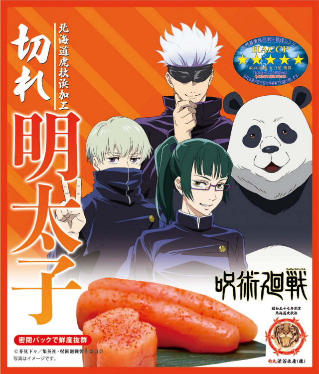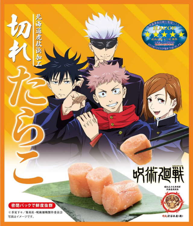 竹丸澀谷水產將與《咒術迴戰》合作推出聯名海產商品,以主角虎杖悠仁的「虎杖」為名,推出了四款海產:「北海道虎杖濱加工鱈魚子」、「北海道虎杖斌加工明太子」、「虎杖濱加工鱈魚子」、「虎杖濱加工明太子」。