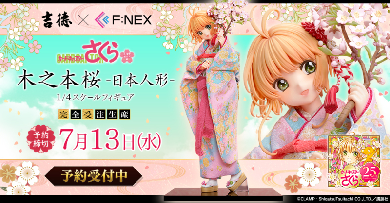吉徳 × F:NEX 日本人形 第七彈「木之本櫻 -日本人偶- 」,以《庫洛魔法使》系列滿 20 周年的慶祝續作《庫洛魔法使:透明牌篇》中的小櫻為主角,採用 1/4 大比例製作,尺寸全高約 36 公分,貫徹吉德的精神,將小櫻自然的肌膚、泛紅的臉頰與水亮大眼細膩雕塑,甜甜的微笑表情相當燦爛動人;手捧著一枝櫻花,頭上的呆毛與髮絲生動飄逸,搭配五顏六色的髮飾,增加了整體充滿春天氣息的可愛和美麗~