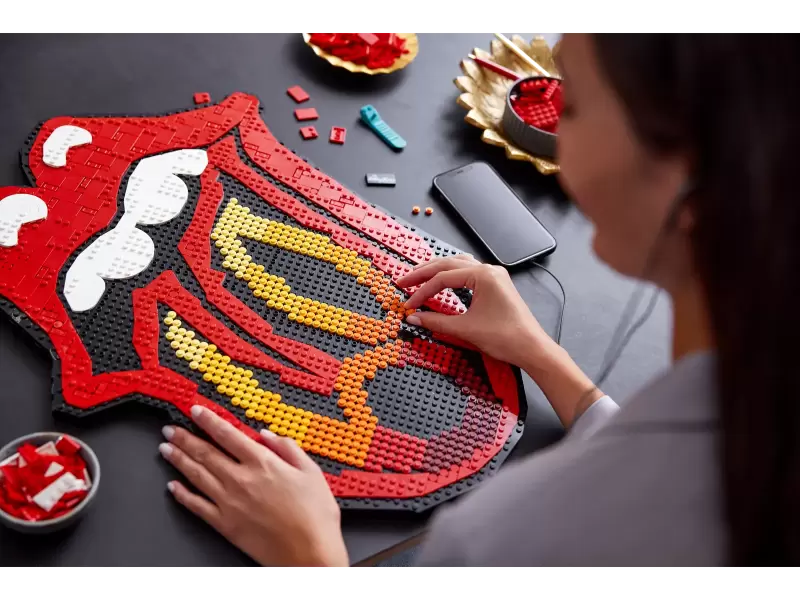 本作一共有 1998 片零件,組裝完成之後的高度來到 57 公分極具存在感,不同於先前樂高的 LEGO Art 系列商品幾乎都是方方正正的造型,這次的「31206 滾石樂團」直接拼出一個不規則形狀的嘴唇與舌頭模型,以紅、白、黑色零件充分還原當初由 John Pasche 於 1970 年的設計,而且能夠在右下方看到印有 the Rolling Stones EST.1962 的零件,超讚的是,掃描盒組當中附上的 QR Code 就能一邊組裝、一邊沈浸在滾石樂團的原聲帶當中,大約有一小時左右的量身訂製內容可以收聽!