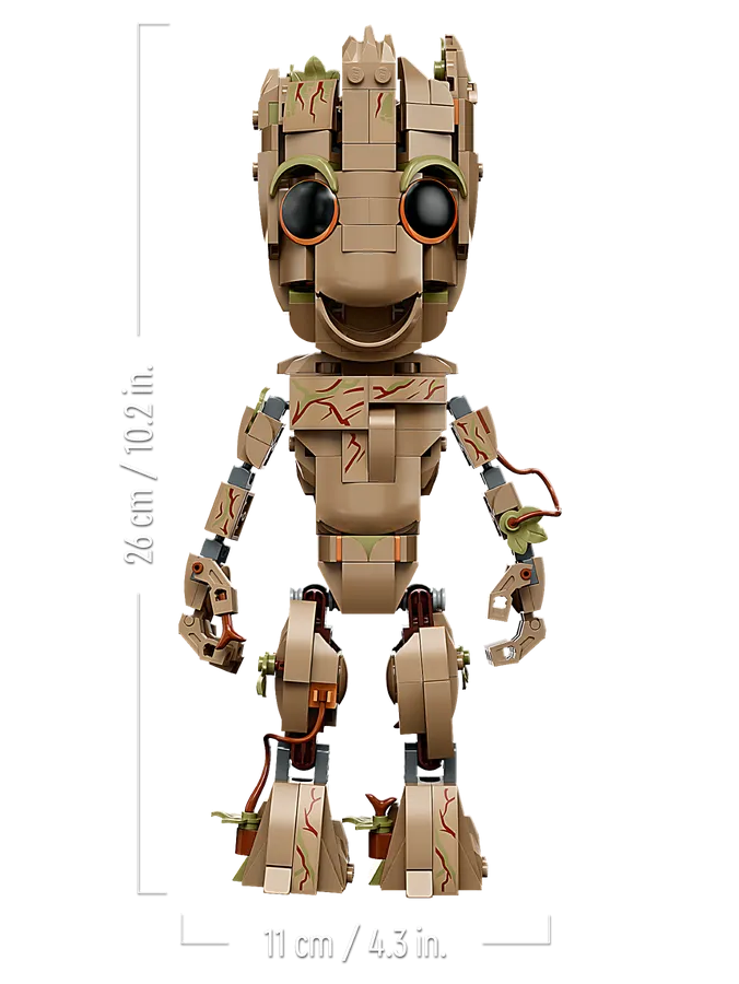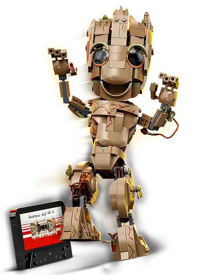 本作一共有 476 片零件,組裝完成之後可以得到一個高約 26 公分的「小格魯特」可動模型,除了利用大量的褐色零件、平面磚勾勒出頭部與身體的造型之外,還利用貼紙、小樹苗、葉片讓這款磚拼模型更有樹木般的視覺效果,除了四肢的可動關節之外,就連手指部分也是獨立可動的形式,可以擺出不少有趣的造型,在小格魯特本體之外,商品內容還有復古味滿滿的「Awesome Mix Vol.2」卡式錄音帶,以及一個理應是要記載著小格魯各種資訊的名牌,不過仔細一看,會發現身高、體重、能力......等全都是 I am Groot!笑翻。
