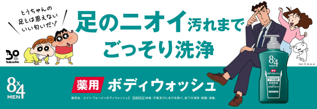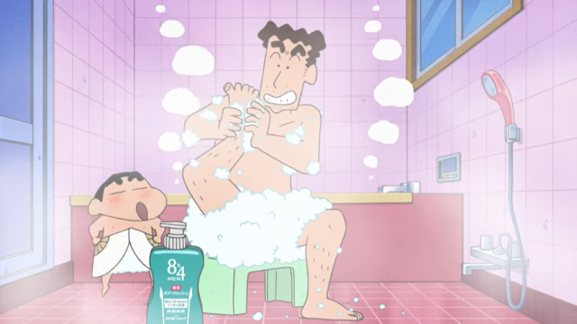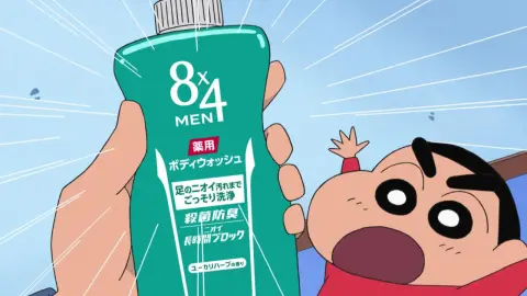 官方也特別以動畫的方式,以小新因為腳臭味發現遠遠回到家的廣志爸爸,到玄關迎接爸爸的美冴拿出了這一款「專治男性腳臭沐浴乳」,讓小新與爸爸溫馨的一同洗澡,洗完澡的廣志有著香氣四溢的腳丫,讓一家人和樂融融。