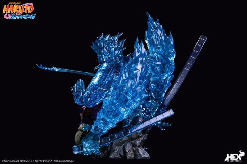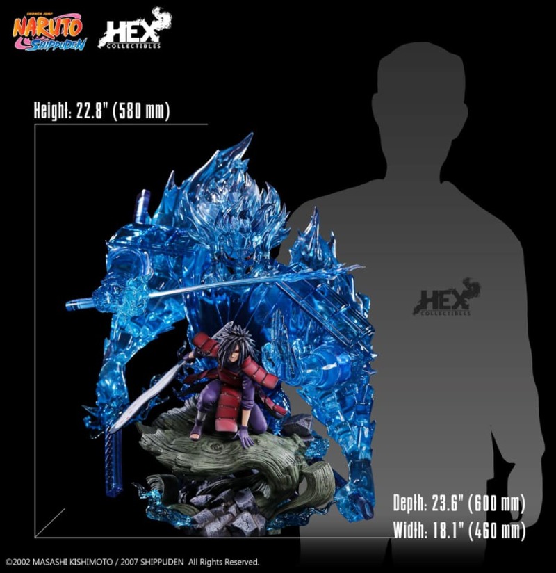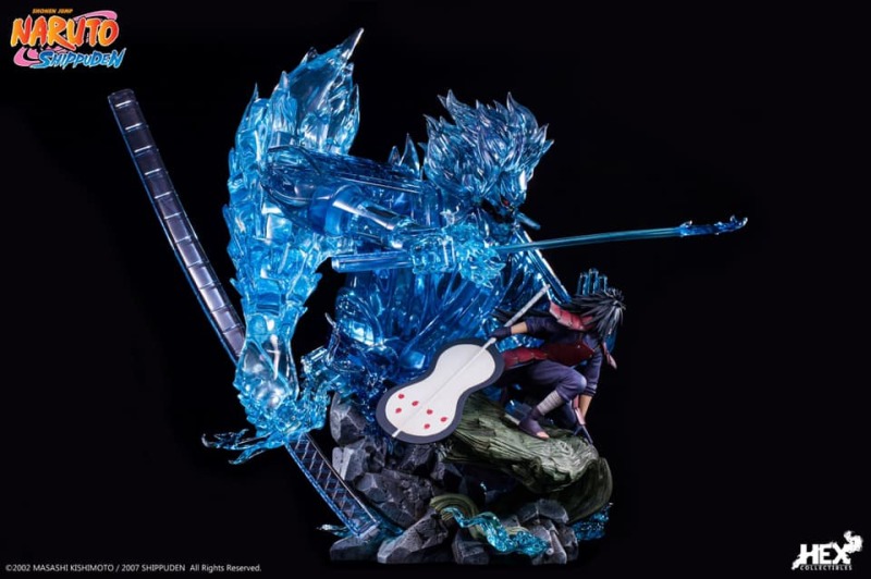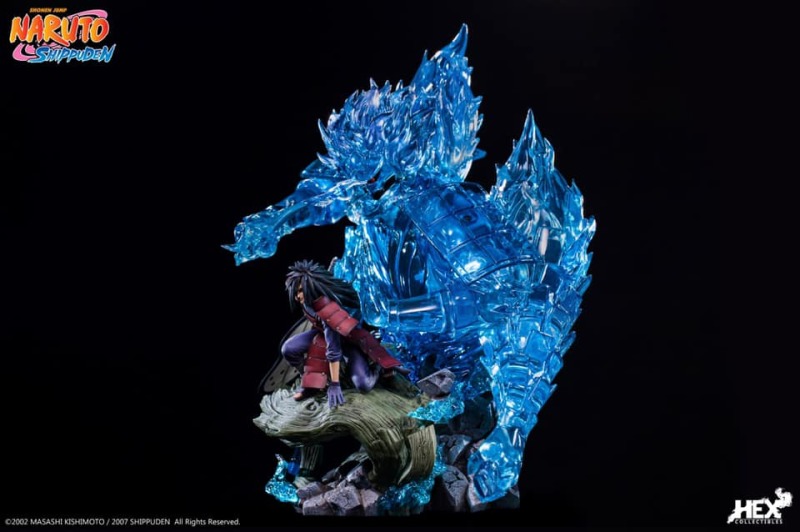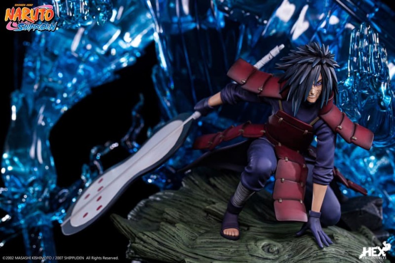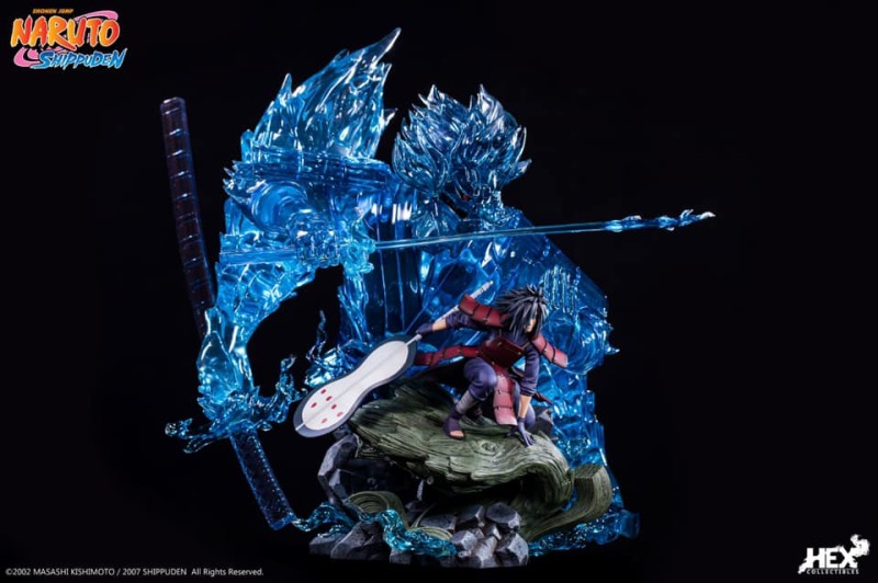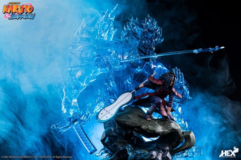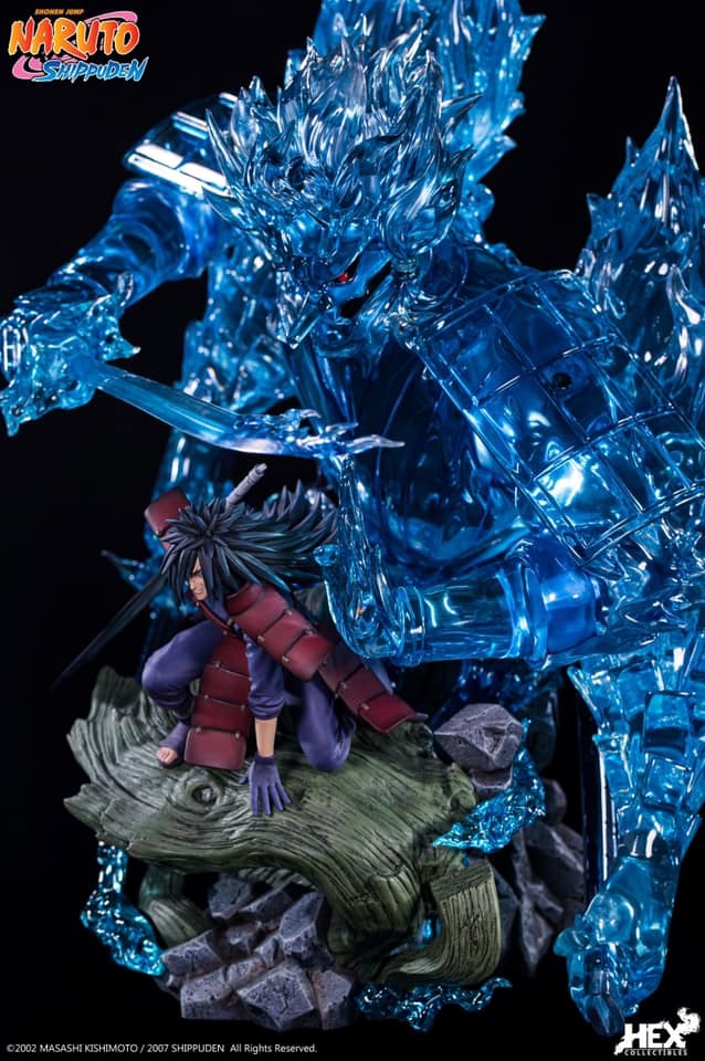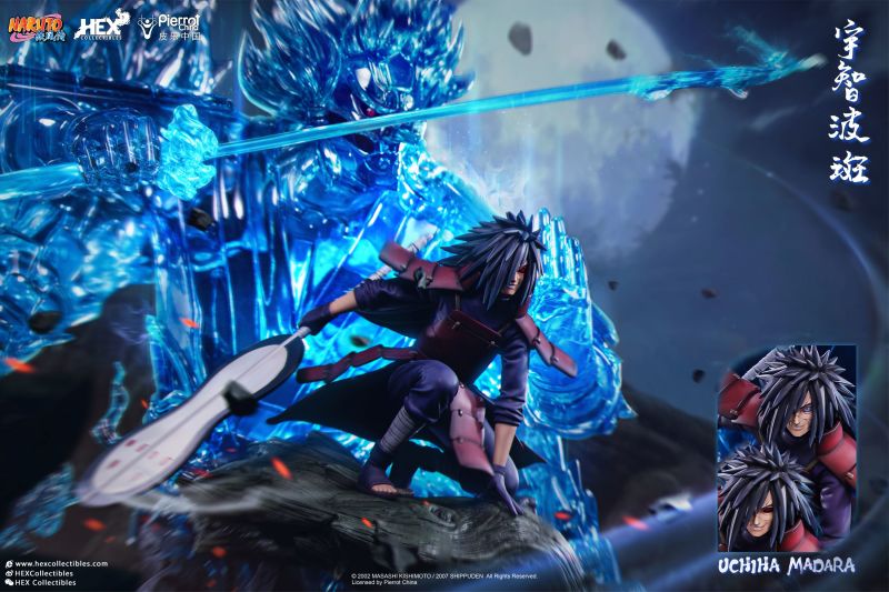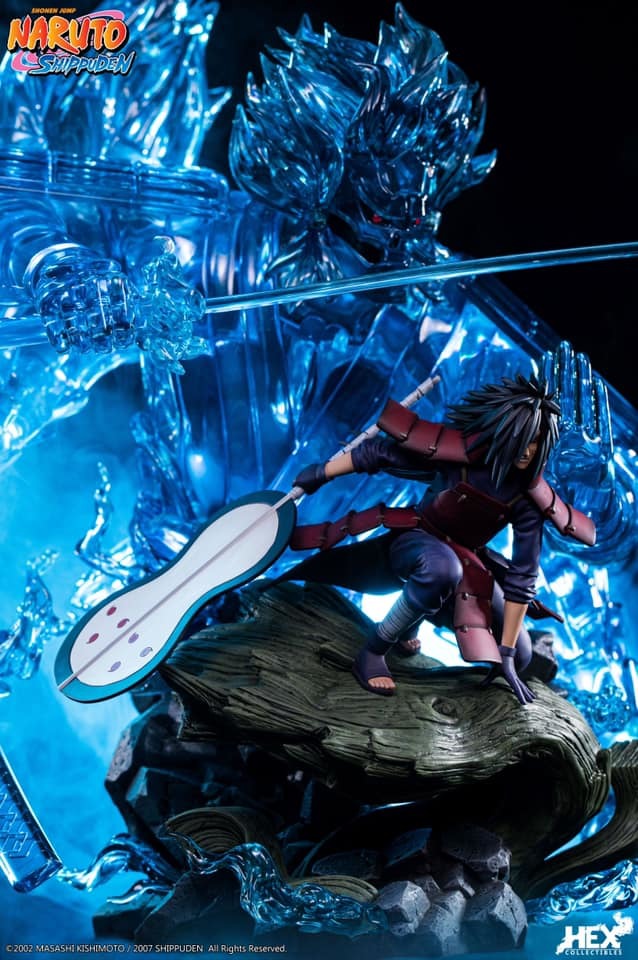 由中國正版授權雕像收藏品牌 HEX Collectibles 推出,全球限量 1000 體的,「宇智波斑 —血繼限界 輪迴眼 須佐能乎」1/8比例場景雕像,以在第四次忍界大戰中被穢土轉生召喚復活的宇智波斑與千手柱間相見後,抑制不住戰鬥衝動而興奮迎戰的場面為基礎,尺寸全高約 58 公分,斑蓄勢待發的蹲姿搭配身後由藍色查克拉透明件組成的巨大須佐能乎完全體,呈現超魄力氣勢!