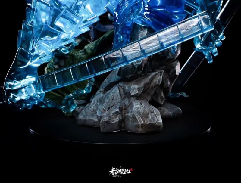 ▼背后巨大的完全體須佐能乎屹立于地台之上,由藍色透明特效件打造,巨大的臂膀與羽翼、持巨劍的手掌交錯重疊。附有兩款替換頭雕。