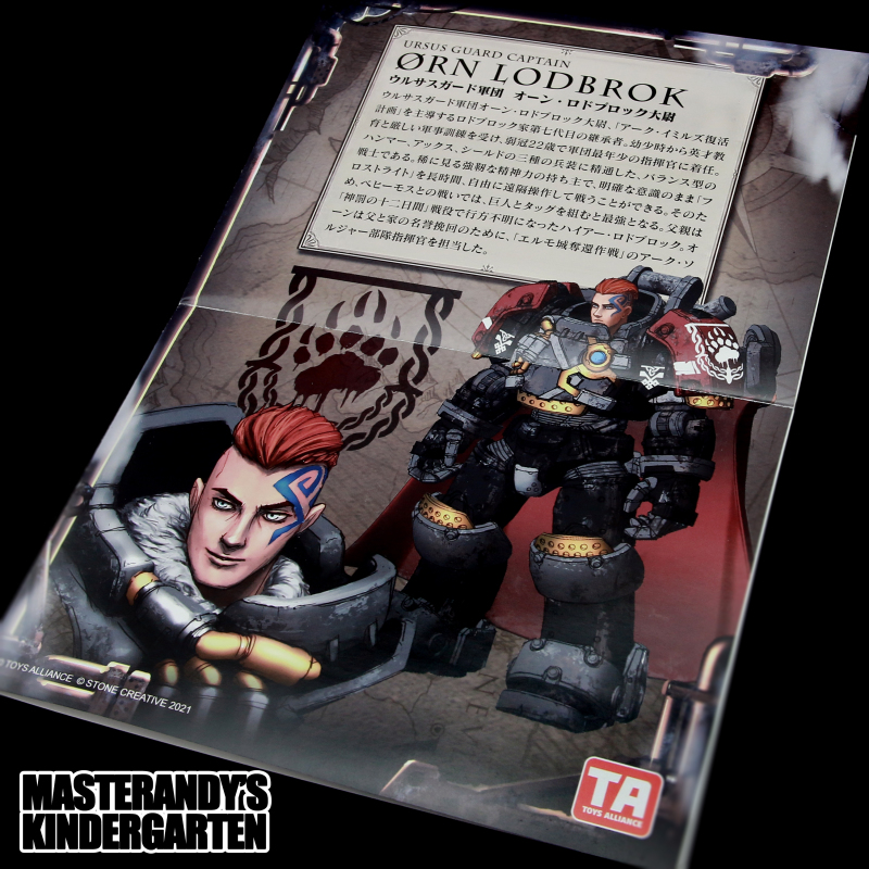 這回的開箱雖然來得有點遲,但基於好玩具一定要認真推坑的信念,這裡還是要和大家分享一下。首先登場的是當然是系列作的第一款作品:主人公維克王國灰熊守衛軍團領導軍官「奧恩.羅德布洛克」(Ørn Lodbrok)!在官方的人物設定中,年輕的奧恩是名優秀的軍官,為了尋找在神罰十二日中失蹤的父親,他毅然決然加入艾蒙奪還作戰,並擔任幻古戰士的部隊指揮官。奧恩自小就接受了完整而良好的軍事教育,擅長盾、鎚、斧、槍等武器的使用,除了顯赫的世家背景,他也繼承了羅德布洛克一族驚人的精神力,能夠在自身意識清楚的情況下操控冰霜巨人(Frost Light)進行作戰,可說是維克王國相當重要的軍事人才。