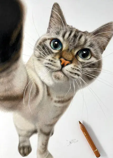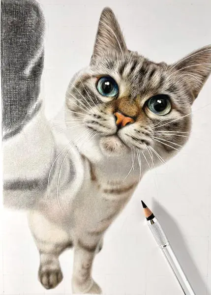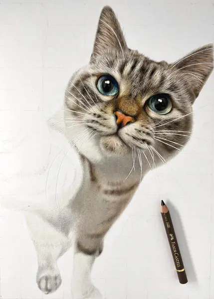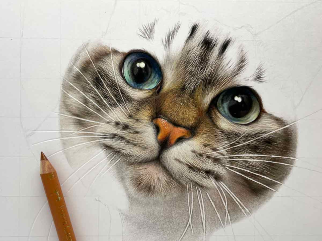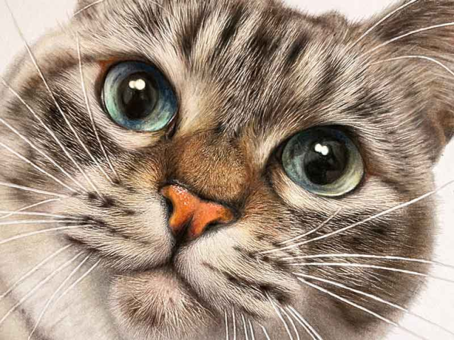 整幅畫大概花了 25 個小時的創作時間,連貓咪的瞳孔裡都可以看到主人拍照的反射樣貌,對於細節真的是掌握十足。