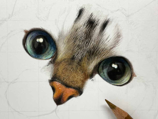 運用色鉛筆的筆觸與色塊疊層,一步步將貓咪的容貌繪製出來~