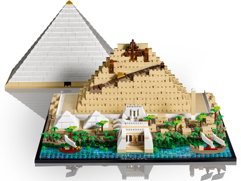 位於埃及開羅吉薩高原的吉薩金字塔群,主要是由胡夫金字塔、卡夫拉金字塔、孟卡拉金字塔所構成,一旁還有數個小金字塔、著名的人面獅身像;而這次以最古老胡夫金字塔為主軸樂高化的 21058 共有 1476 片零件,組裝完成之後高約 20 公分,長度則有 35 公分,以微型比例打造出尼羅河沿岸在古代埃及時的模樣!除了最搶眼的胡夫金字塔外,還能看到兩座小金字塔、兩座祭殿、小小的人面獅身像、兩艘埃及風帆船 Felucca、方尖碑,與一個迷你的工人。