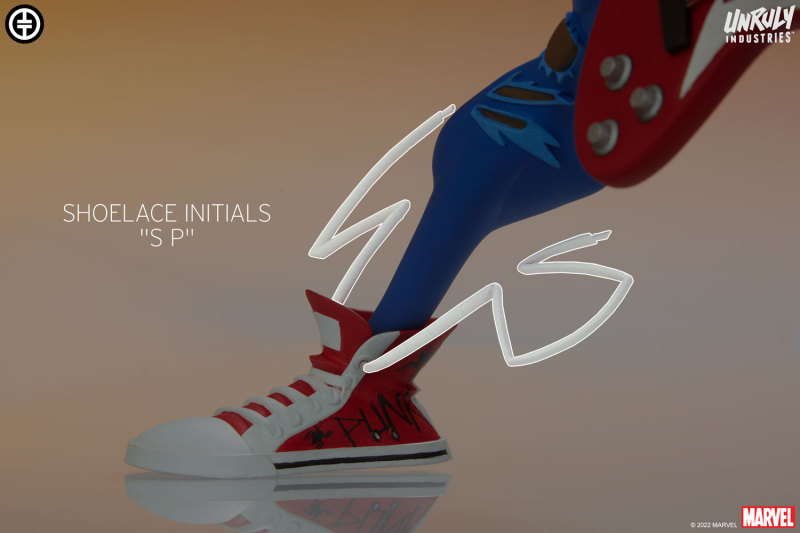對於球鞋、漫畫、超級英雄深深著迷,並熱衷於探索英雄、球鞋背後起源故事的藝術家 Tracy Tubera,擁有將球鞋&英雄融合在一起的強烈設計風格,並展開了「Super Heroes in Sneakers (S.H.S.)」的設計玩具系列;本次由他重新詮釋的「龐克蜘蛛人」高約 21.6 公分,龐克蜘蛛人原本就極為搶眼的造型經過重新詮釋後變得更加誇張,不管是身形比例還是肌肉線條都相當狂野豪放,飛舞的夾克、鞋帶也進一步提升了作品的躍動感,而 Spider-Punk 的縮寫 SP 也融入鞋帶啦。
