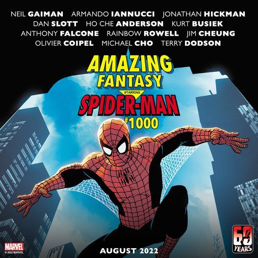 《Amazing Fantasy》#1000將在8月出版,是一部由許多故事組成的巨型特刊,其中包括一連串探索了蜘蛛人的過去和未來的故事。參與該項目的漫畫編劇包括Neil Gaiman、Armando Iannucci、Jonathan Hickman、Dan Slott、Ho Che Anderson與Kurt Busiek,繪師陣容則有Anthony Falcone、Rainbow Rowell、Jim Cheung、Olivier Coipel、Micahel Cho和Terry Dodson。「這可是蜘蛛人的60週年,我們想邀請世界上最偉大的創作者們來一同慶祝它。就是要這麼有型!」這本漫畫的編輯Nick Lowe如此表示。