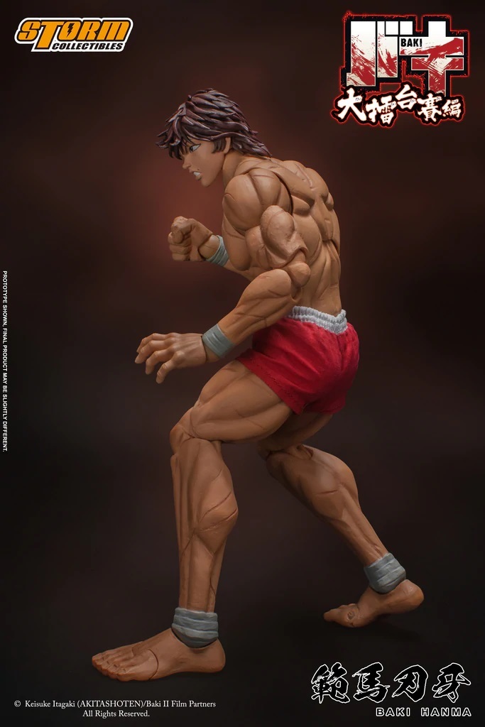 這款由 Storm Collectibles 所推出的範馬刃牙,同樣為 1/12 比例,以刃牙在第二部時期的中國大擂台篇時期的他為外型基準參考,最大的特徵當然就是刃牙身上強壯的肌肉,以及四處都有的傷痕,都細膩地還原出來,身上的衣裝僅有比賽競技時的短褲,為了能還原各種伸展度高的肢體動作,特別以布料製作短褲。各種原作中例如高踢等動作與姿勢,都可以完整再現。其他的配件方面,有五組可以替換的手部零件,四個頭部表情零件。