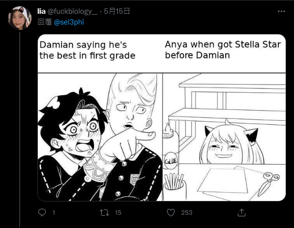 事實上,這一幕不只是還原的原著漫畫中的名場景,也就是安妮亞那最經典的「呵」一笑,更因為這充滿「迷因潛力」的一集,讓歐美觀眾粉絲也忍不住將安妮亞的嘲諷笑,還有達米安被欺負的模樣,套上了全球瘋傳的「女人吼貓」迷因,我說天啊,這根本無違和吧XD