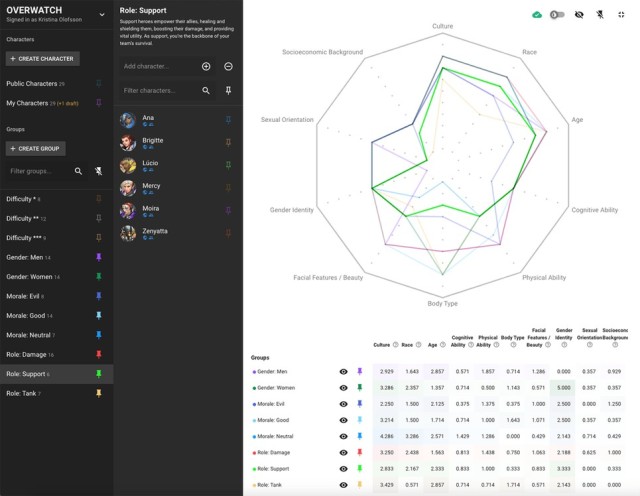 而對於動視暴雪來說,這麼做的目的,無非就是為讓旗下電玩角色更具多樣化,透過實際數據來減少種族歧視、性別歧視、刻板印象…等問題。其中官方也以《鬥陣特攻》(Overwatch)的知名角色「安娜」來做為範例,可以看到該名角色所得到的「量化分數」會依照不同的類別,以圖像化來呈現。