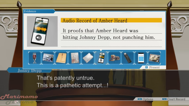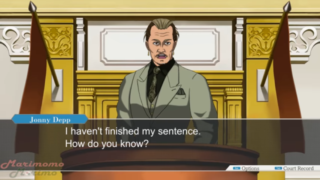 說到這裡,在座各位朋友或許也想起了最近來自於YouTube上,以強尼戴普與安柏赫德這場官司為主題的惡搞創作。這是來自名叫MARIMOMO MORIMO的創作者,近日以來所分享的…《逆轉裁判:安屎之亂》一系列的影片創作,至少請讓我這樣稱呼。