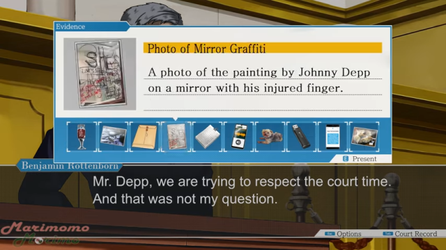 而到目前為止,MARIMOMO MORIMO的製作進度也已經來到了第六支影片,包含強尼戴普的保鑣康諾里(Malcolm Connolly)被安柏赫德的律師問及的「小便問題」,以及「有沒有掏出陰莖」等超荒唐對話,也全都收錄在該名YouTube創作者的遊戲影片中。對了,連同強哥笑慘的畫面也忠實還原。