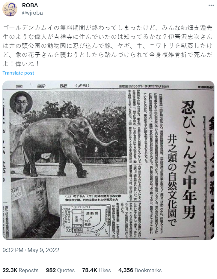 其實這是一件發生在 1956 年的日本駭人事件,東京武蔵野市的井之頭公園內動物園「井之頭の自然文化園」,發現一位 45 歲的男性上班族伊吾沢忠次,以幾乎全身赤裸的姿態陳屍在象舍旁二公尺深的壕溝裡,據說他之前曾潛入動物園內,陸續侵犯了豬、羊、牛、雞,最後因試圖侵犯園內 9 歲的大象花子,花子因為受到驚嚇反抗而踐踏了該名男子,導致全身複雜性骨折而死。