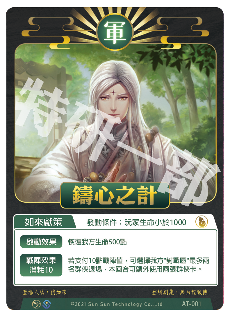 軍師卡在每一場遊戲中只能發動一次,當玩家身處於劣勢時!達成條件可發動該軍師卡效果,也可額外消耗該軍師卡上述所需之戰陣值即可發動有機會逆轉戰局的第二效果,可說是每副牌組中缺一不可的一張卡(每副牌只能選擇一張軍師卡使用)。