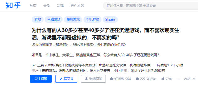 當然,這些無謂的煩躁話也不只是會從你身邊親近的人口中說出,近日在中國知乎就有一位網友的問話,引起了不少電玩玩家的不滿。斗大的標題不僅寫著「為什麼有的人30多歲甚至40多歲了還在沉迷遊戲,而不喜歡現實生活,遊戲裡不都是虛擬的,不真實嗎?」甚至還特別將手機遊戲《王者榮耀》分門別類,認為那不算是遊戲,而是社交軟體。