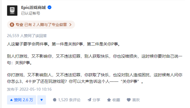 「人這輩子要學會兩件事。第一件是關我P事,第二件是關你P事。別人打遊戲,又不影響你,又不違法犯罪,別人獲取快樂,你也沒啥損失,這時候你要對自己說一句:關我P事。」中國Epic Games接著又說:「你打遊戲,又不影響別人,又不違法犯罪,你獲取了快樂,也沒對別人造成困擾,這時候有人問你你怎麼3、40歲了還在玩遊戲呢?你可以大聲告訴這個人——“關你P事”。」