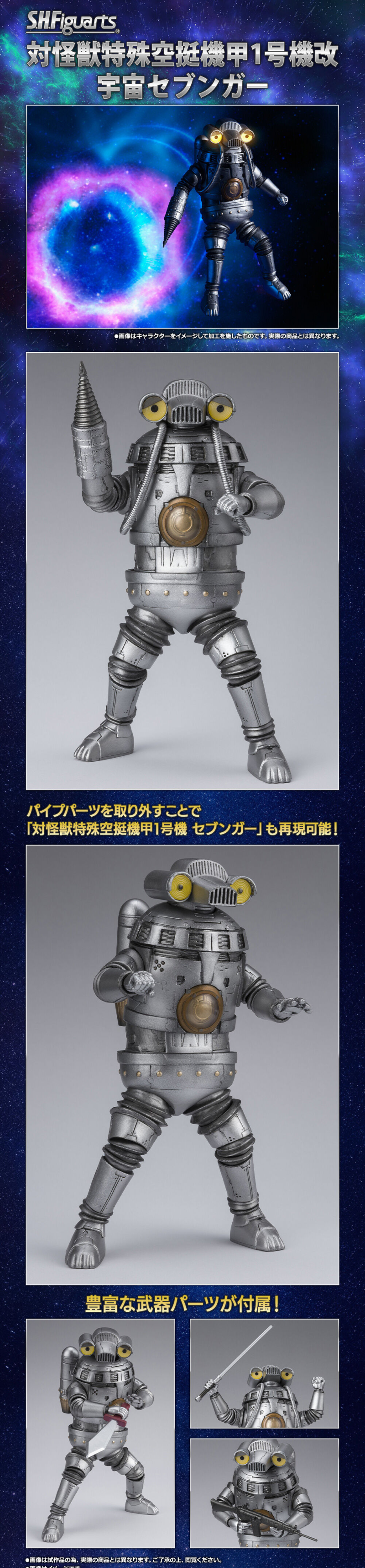 本次登場的「S.H.Figuarts 對怪獸特殊空挺機甲 1 號機改 宇宙賽文加」可動人偶,尺寸全高約 150mm,以先前推出的版本為基礎,進行了素體的升級,改良了賽文加容易腿軟的問題,強化後的可動腿部、腰部關節,能更自由地賞玩姿勢(已買初版的玩具人QQ),能夠展現在太空中發揮積極作用的模樣。另外,整體施以明亮的銀色塗裝,更接近劇中的造型;背後的噴氣口也有焦色的真實感塗裝。