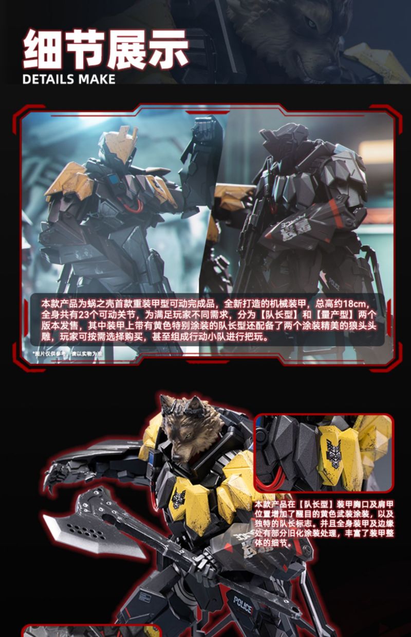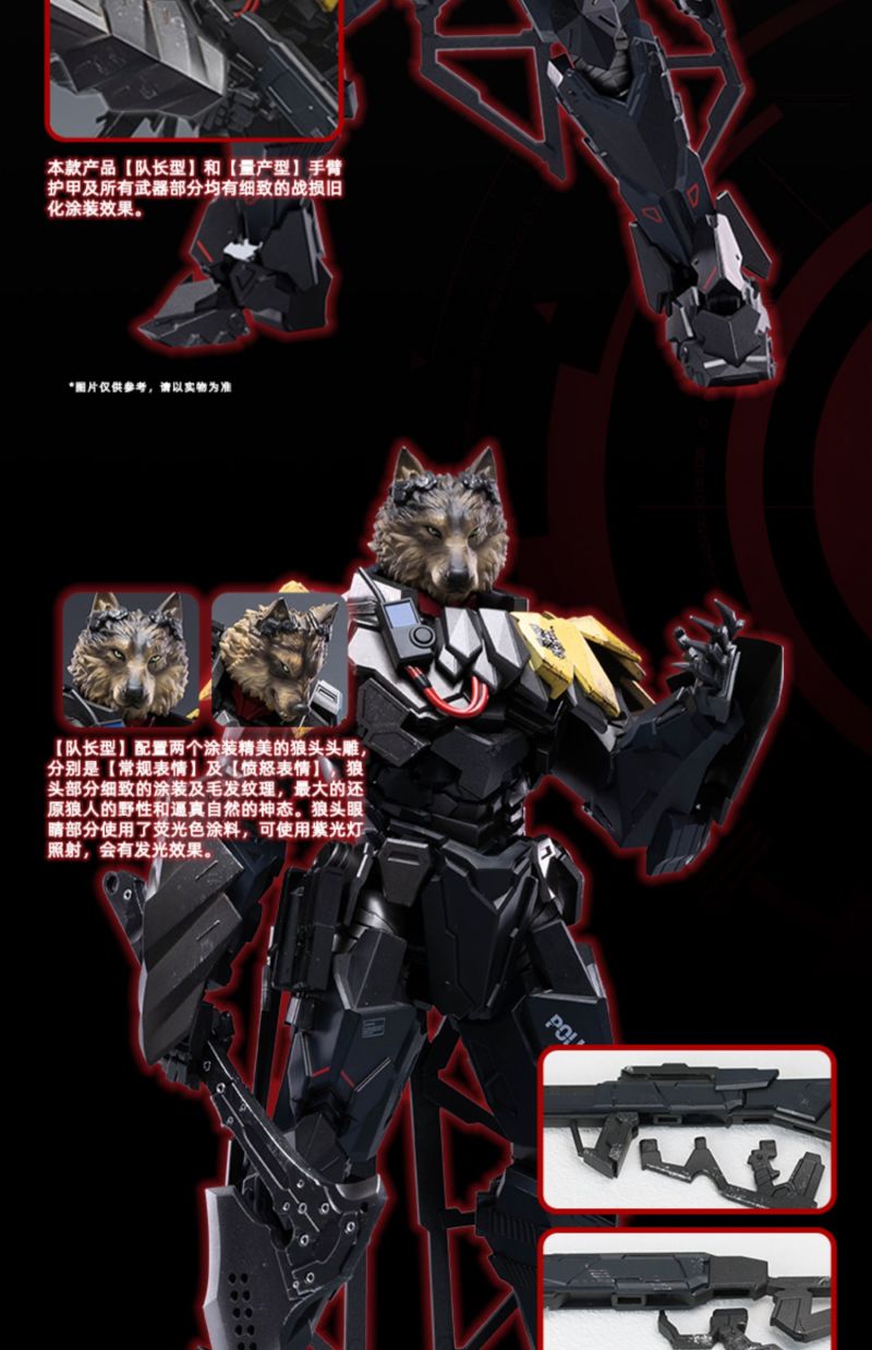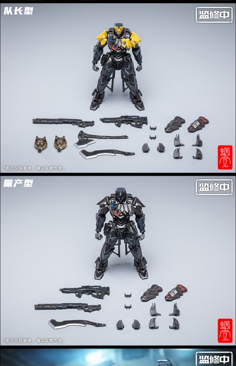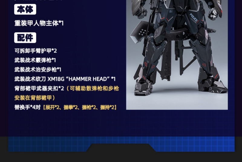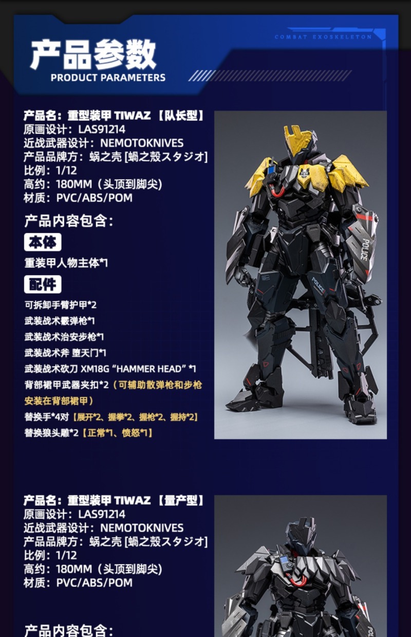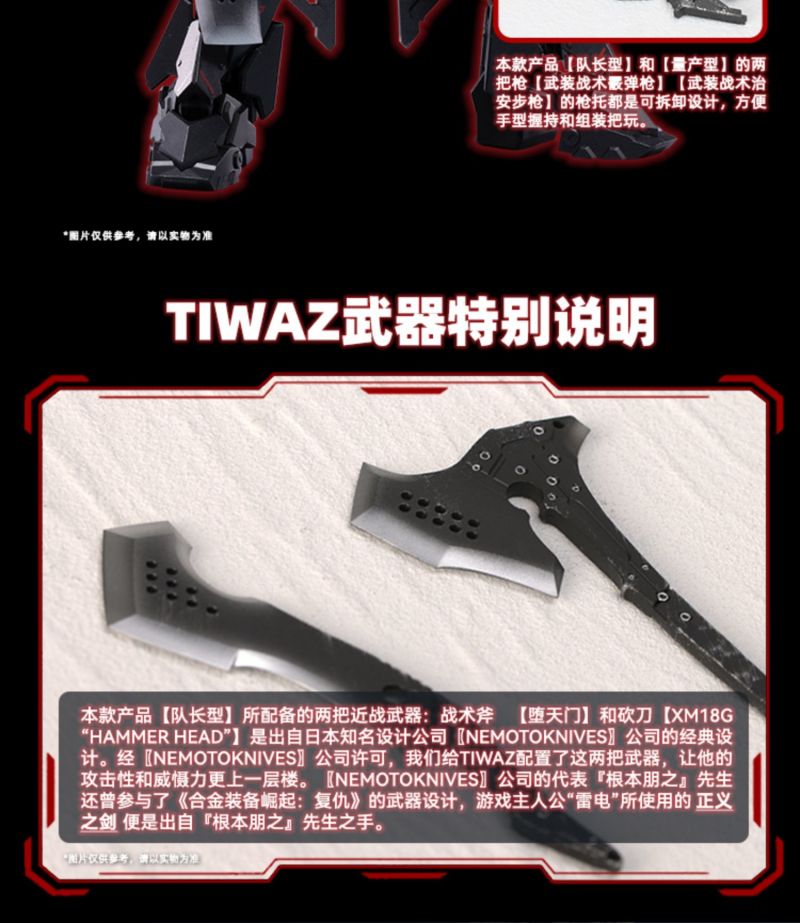 「重型裝甲 TIWAZ 量產型」 1/12 比例可動完成品,尺寸全高約 18 公分,將任何時候都忠心執行隊長命令的 TIWAZ 隊員還原。細膩在手臂護甲及武器等處施以舊化塗裝以及戰損細節,另外近戰武器砍刀「XM18G “HAMMER HEAD”」更是出自日本知名設計公司 NEMOTOKNIVES 的設計,讓整體武裝更具有攻擊性和威懾力!另外還有射擊武器戰術霰彈槍和治安維持用自動步槍,搭配一身金屬黑,俐落且帥氣十足。