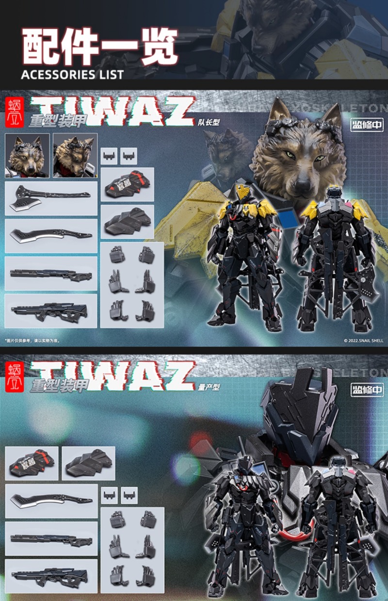 「重型裝甲 TIWAZ」為蝸之殼工作室全新打造的系列,結合知名機甲設計師 LAS91214 的設計,將 LAS 筆下複雜的機械細節立體化。重型裝甲 TIWAZ 的機動部隊隊長「Z」,為前軍人出身,有著狼人的造型。他正直可靠、絕不容忍法外勢力,為貫徹自己的正義而與「JINROU」交戰,並開始重新思考「該守護的東西」的定義……。