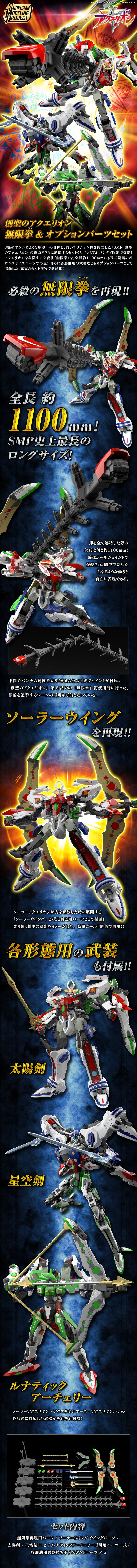 而 PREMIUM BANDAI 限定販售的「無限拳&擴充零件組」則包含三種形態各自的專用武裝「太陽箭」「月亮弓」「星空劍」等,更有太陽亞庫艾里翁力量解放時背部中展開的魄力「太陽羽翼」,以及全長可達 110 公分的招牌必殺技「無限拳」特效零件!無限拳由 5 組延長零件組成,同時也附上轉彎用的連接零件、5 組專用台座,能夠自行調整無線拳的長度與方向。